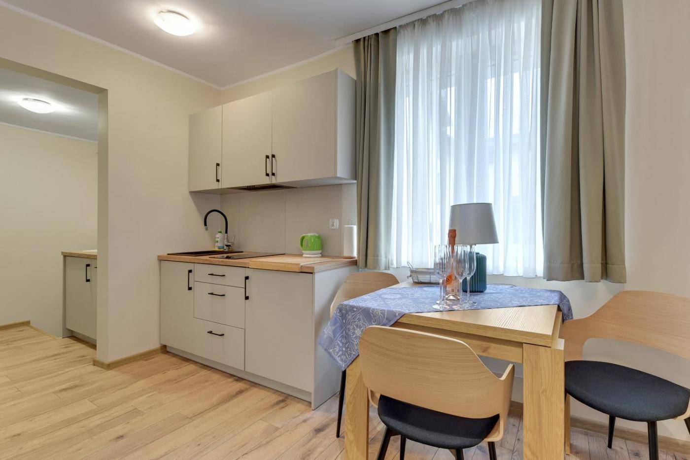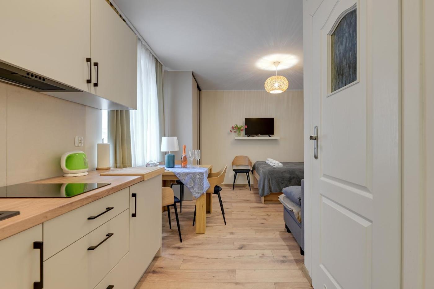 Apartament typu studio. This apartment includes a kitchen, a seating area, 1 separate bedroom and 1 bathroom with a shower and a hairdryer. In the kitchen, guests will find a stovetop, a refrigerator, kitchenware and a tea and coffee maker. The apartment offers a flat-screen TV, a washing machine, a wardrobe, parquet floors as well as ancourtyard view. The unit has 2 beds. Apartament - 4 osobowy. Powierzchnia pokoju ok.: 24 mkw.